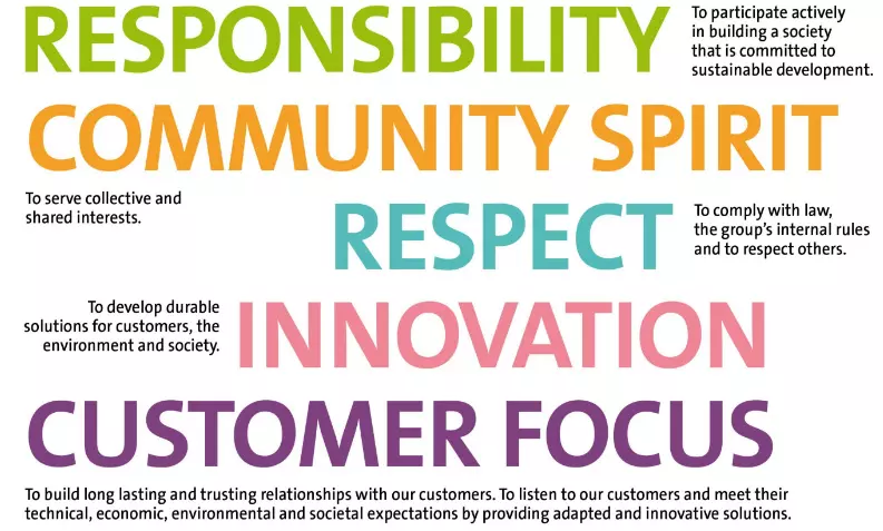 The core values of Veolia are responsibility, solidarity, respect, innovation and customer focus.