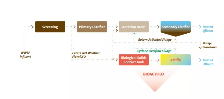 It involves a biological treatment - in a pre-contact tank, polluted water (BOD) is treated by activated sludge - followed by a high-performance secondary clarification: Actiflo®.