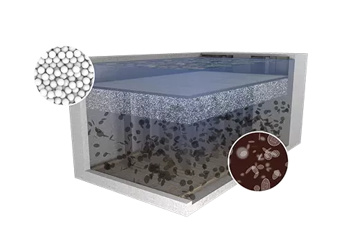 MBBR填料被添加到Biostyr生物滤池中,和Biostyrene滤料并存,该滤料是根据应用需要的规格,专门制造的聚苯乙烯小球。这些小球被截留在混凝土滤池(单元)的滤板下,滤板配有滤头,处理后的水通过滤头排出。