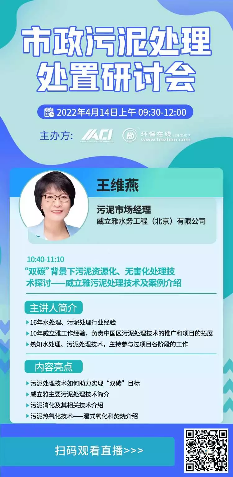 2022年4月14日 上午10:40-11:10,威立雅水务技术中国市政污泥市场经理王维燕女士,将围绕“双碳”背景下中国市政污泥资源化、无害化与大家分享威立雅的污泥处理技术及最新案例。